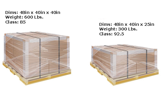 Stacking or combining pallets is another method you can use to control dimensional freight classification. The pallets displayed below have freight classes of 85 and 92.5. However, by stacking the pallets together the dimensional freight class of the resulting pallet is only 85, which will generally result in a lower over all cost than the higher rated, seperate pallets.